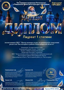 Воспитанники Центра помощи детям под руководством методиста Майер Снежаны Евгеньевны приняли участие в Международном конкурсе «Наследие» с работой «Россия - Семья семей". По результатам конкурса участники получили лауреат 1 степени!!